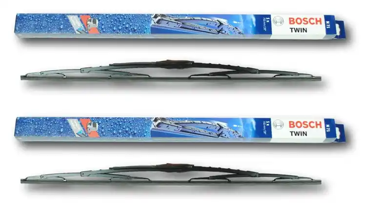 Nowe wycieraczki – zapakowane w oryginalne opakowanie producenta – cena zakupu dotyczy 1kompletu (strona kierowcy i pasażera).Wycieraczki Bosch Twin – na przednią szybę – posiadają metalowy stelaż. Jest on bardzo solidny i dwukrotnie lakierowany. Wewnątrz gumy znajduje się szyna stabilizująca odpowiadająca za prawidłowe przyleganie wycieraczki. Do konstrukcji pióra wycieraczki zastosowano 2 rodzaje gumy. Na górze znajduje się część miękka odpowiadająca za cichą pracę, natomiast na dole twarda, która ma za zadanie precyzyjne czyszczenie szyby ze śniegu, wody itp. Dodatkowo pokryta jest specjalną powłoką, powodującą lepszy poślizg na szybie, aby siła tarcia była jak najmniejsza.  Jak dbać o wycieraczki:- pamiętaj, aby dbać o gumę wycieraczki usuwając z niej brud, owady itp., które osiadły podczas jej pracy (wykorzystać można do tego łagodny detergent); zapominanie o usuwaniu zanieczyszczeń, może doprowadzić do uszkodzenia gumy wycieraczki- nigdy nie używaj wycieraczek, gdy szyba jest sucha;  tarcie gumy po suchej szybie może doprowadzić do szybkiego jej zużycia- jeżeli wycieraczka na szybie podskakuje, może to być oznaką, że ramię wycieraczki jest skrzywione; w takim przypadku należy dokonać jego regulacji- jeżeli planujesz pozostawienie samochodu na słońcu przez kilka dni, ustaw wycieraczki tak, aby nie stykały się z szybą- po wizycie na myjni, pamiętaj, aby zawsze dokładnie oczyścić szybę, ponieważ znajdujący się na niej wosk, może powodować przeskakiwanie wycieraczki- pamiętaj również, aby nie uruchamiać wycieraczek na zamarzniętej szybie; może to bowiem doprowadzić do ich uszkodzenia lub oderwania gumy od mocowania.Czy wiesz że:- pierwsza wycieraczka wprowadzona została przez Boscha w okresie międzywojennym w 1926r. i napędzana była silnikiem elektrycznym- pierwszą wycieraczkę bezprzegubową – Bosch wprowadził do produkcji w 1999r.- 750 000 cykli oczyszczania! Tak wycieraczki Bosch są testowane pod kątem wytrzymałości mechanicznej- wycieraczki Bosch są przystosowane do pracy w temperaturach od -30 do +80 stopni Celsjusza.